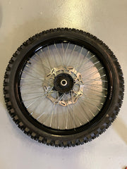 Complete front wheel assembly. Includes wheel, bearings, rim lock, tube, tire (80/100-21), speedometer magnet, spacers, and brake rotor. Ready to install.